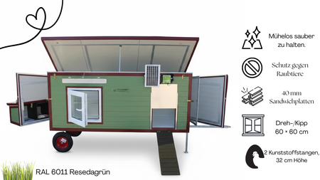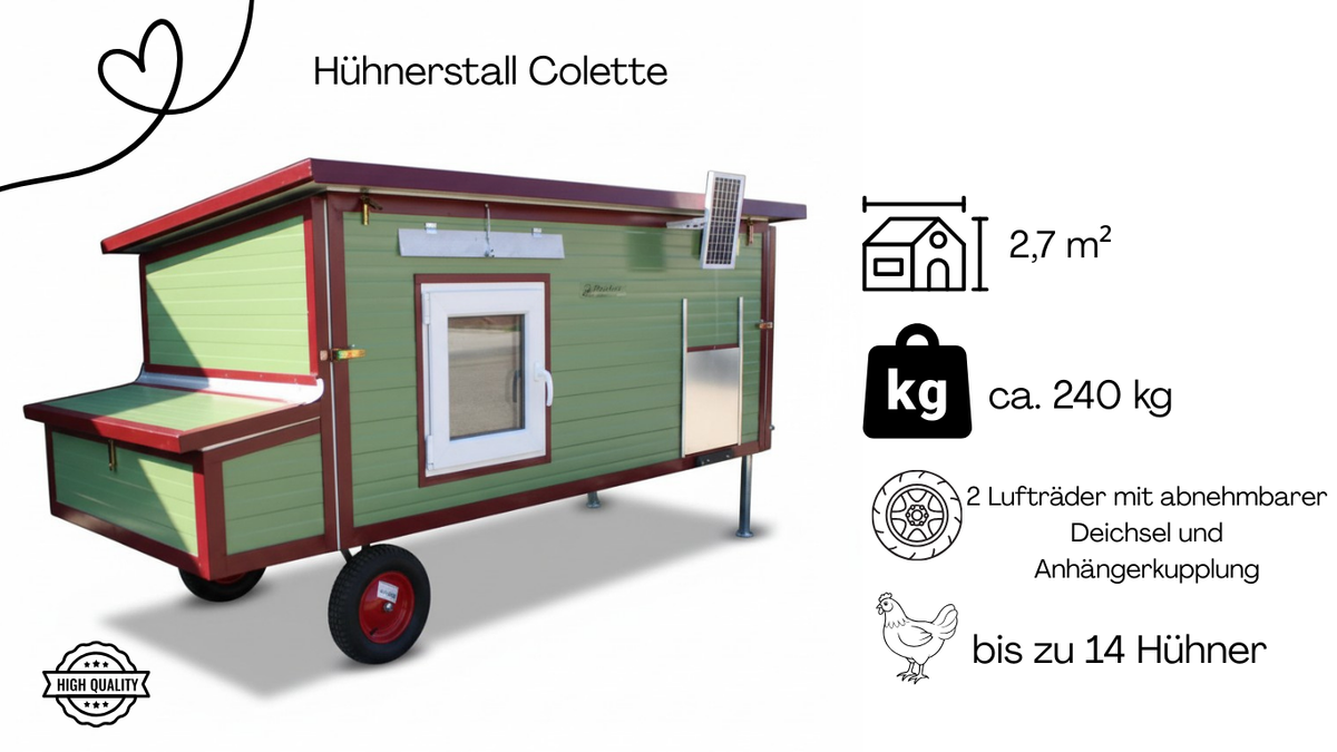 Colette I3 è un pollaio isolato e resistente all'inverno, in grado di ospitare fino a 14 galline, pensato per allevatori che apprezzano comfort, mobilità e durata. La sua struttura in acciaio con pannelli sandwich da 40 mm offre una protezione affidabile in tutte le condizioni atmosferiche. Il modello è dotato di due pneumatici e di un timone rimovibile con gancio di traino , che facilitano lo spostamento della stalla.