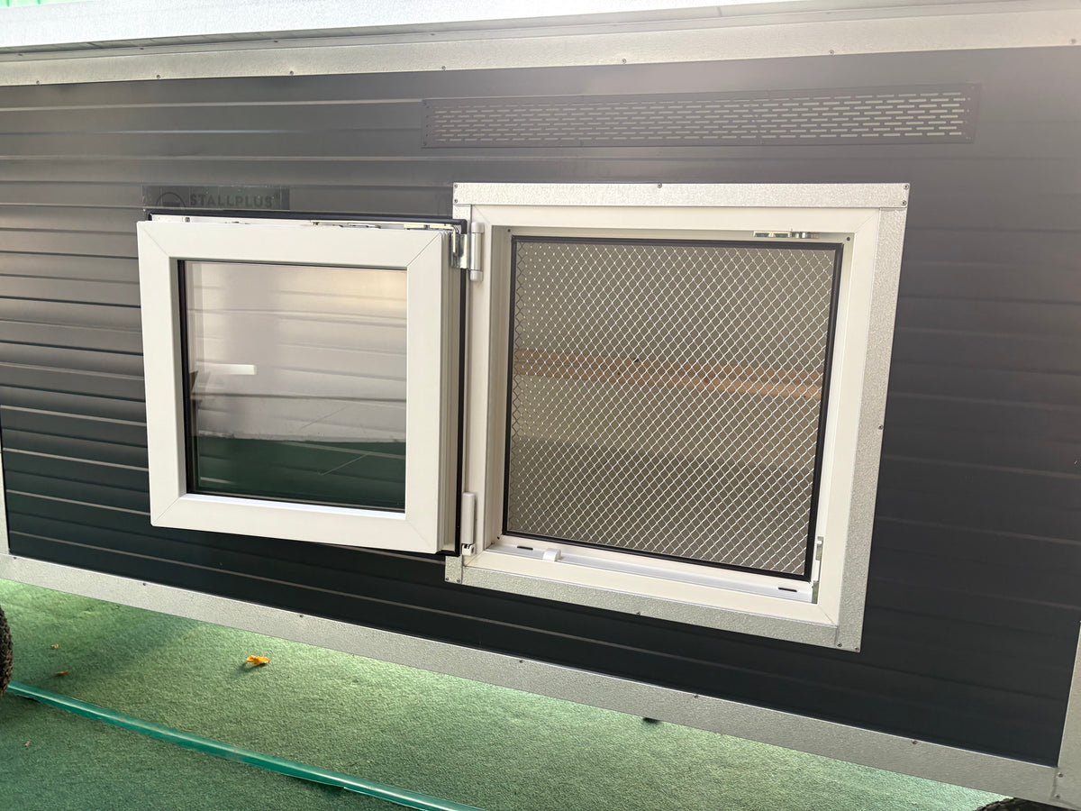 Zwei Seitentüren ermöglichen einfachen Zugang, während das große Dreh-Kippfenster (60 × 60 cm, 2-fach verglast) und ein Lüftungsgitter (75 × 7 cm) für frische Luft sorgen.