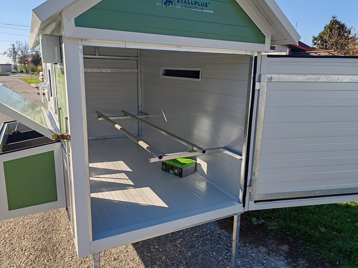 Hühnertüröffnung angepasst für JOST-Technik Klappe / Lackierte Konstruktion / RAL 9002 Grauweiß