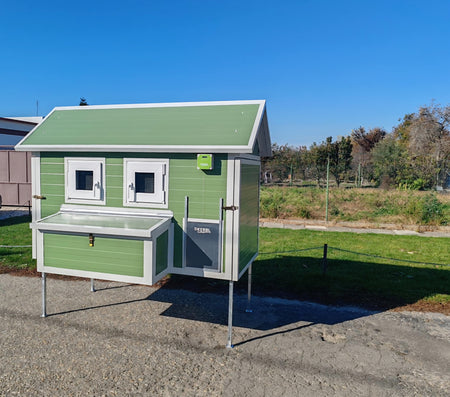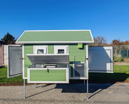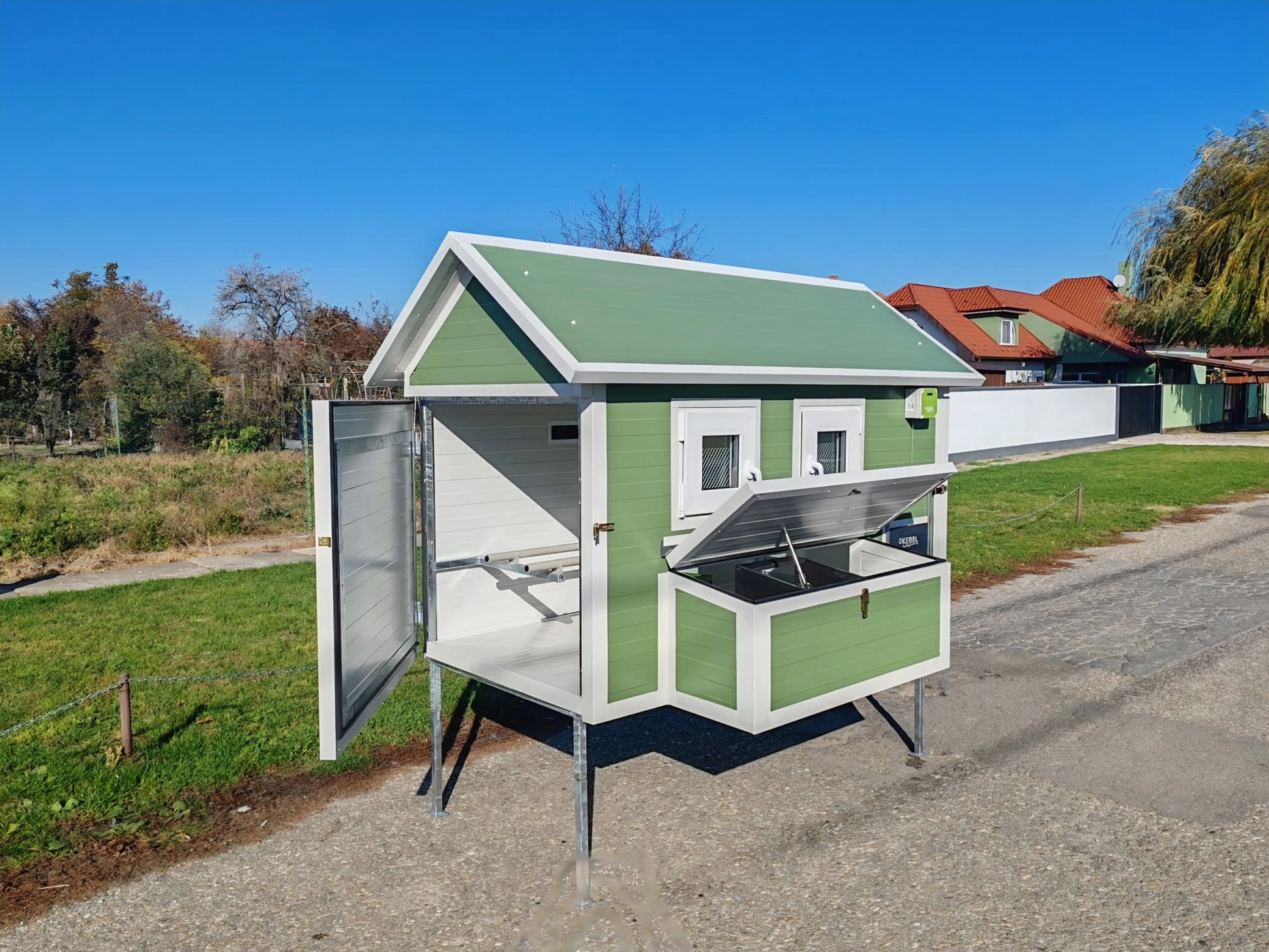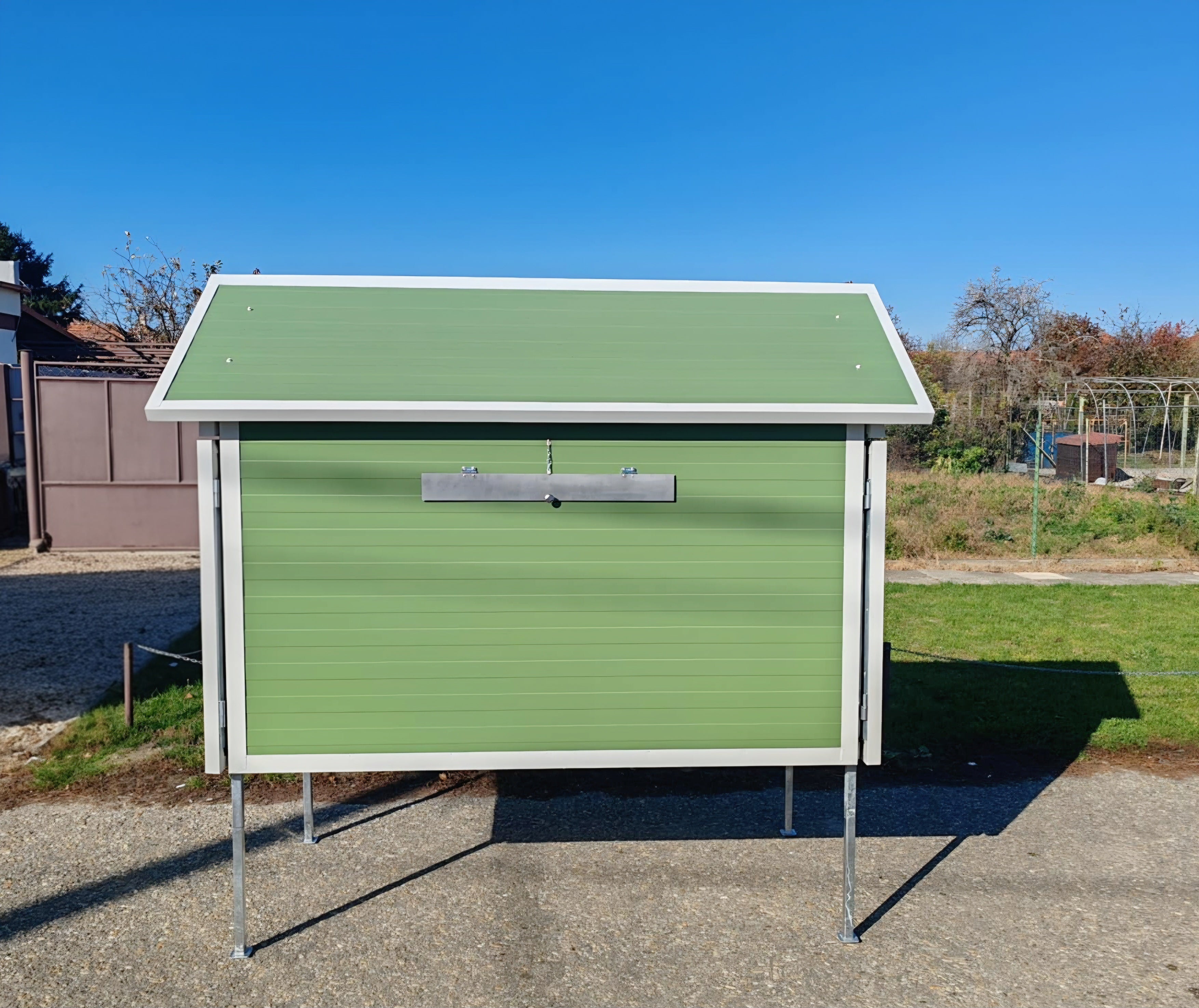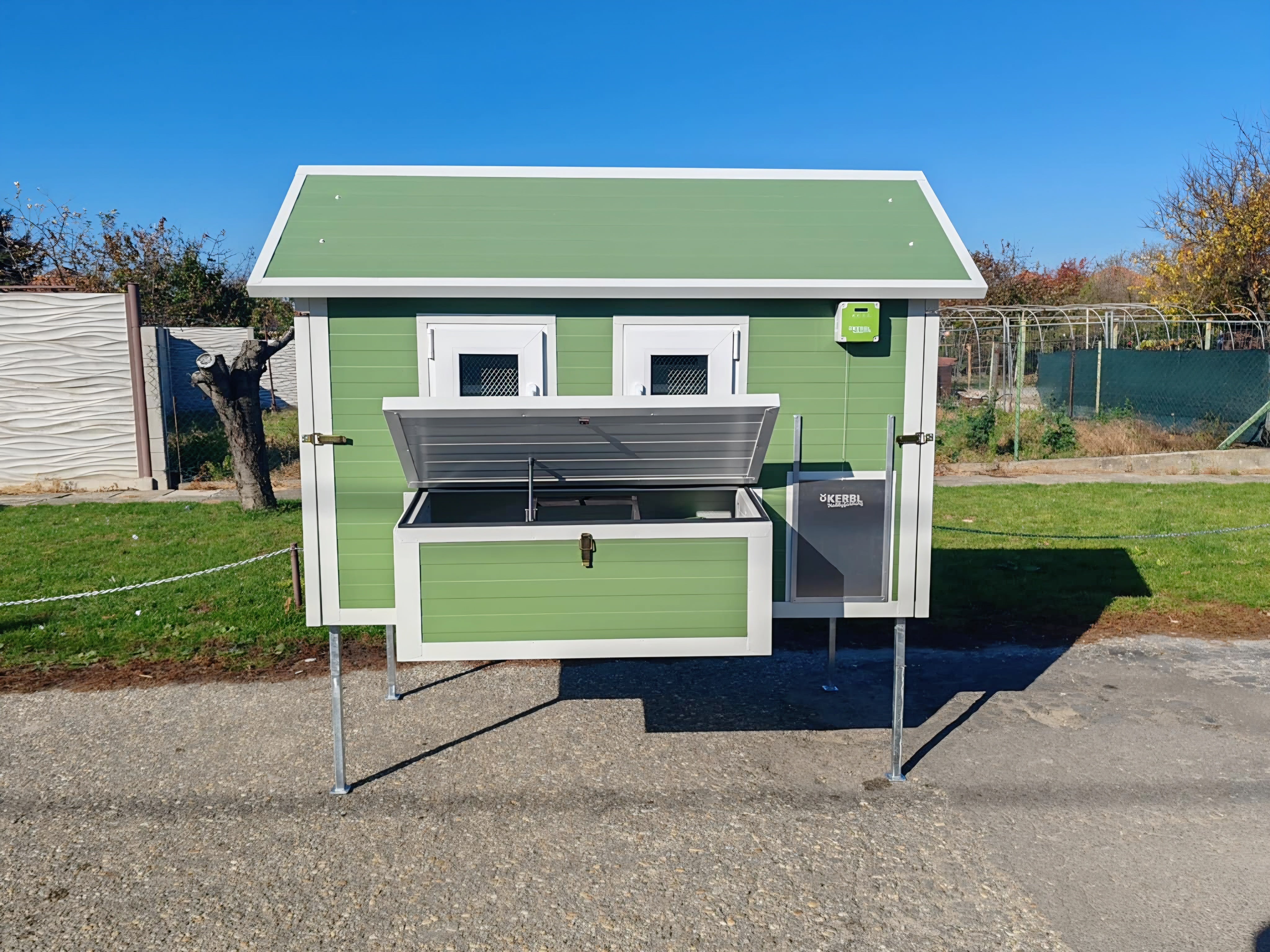 Hühnertüröffnung angepasst für JOST-Technik Klappe / Lackierte Konstruktion / RAL 6011 Resedagrün
