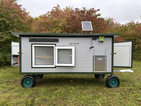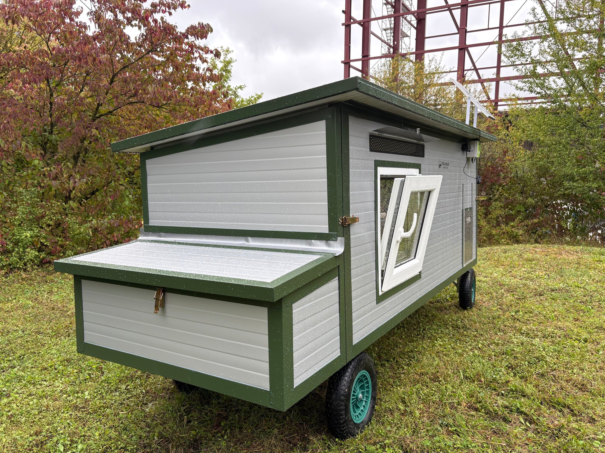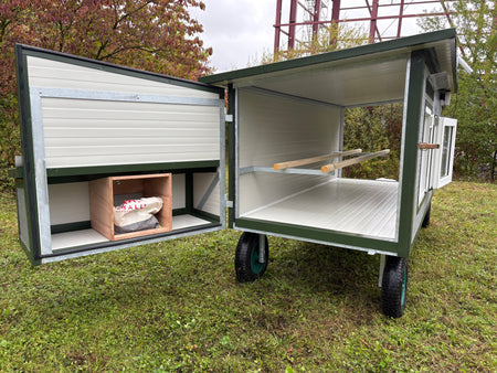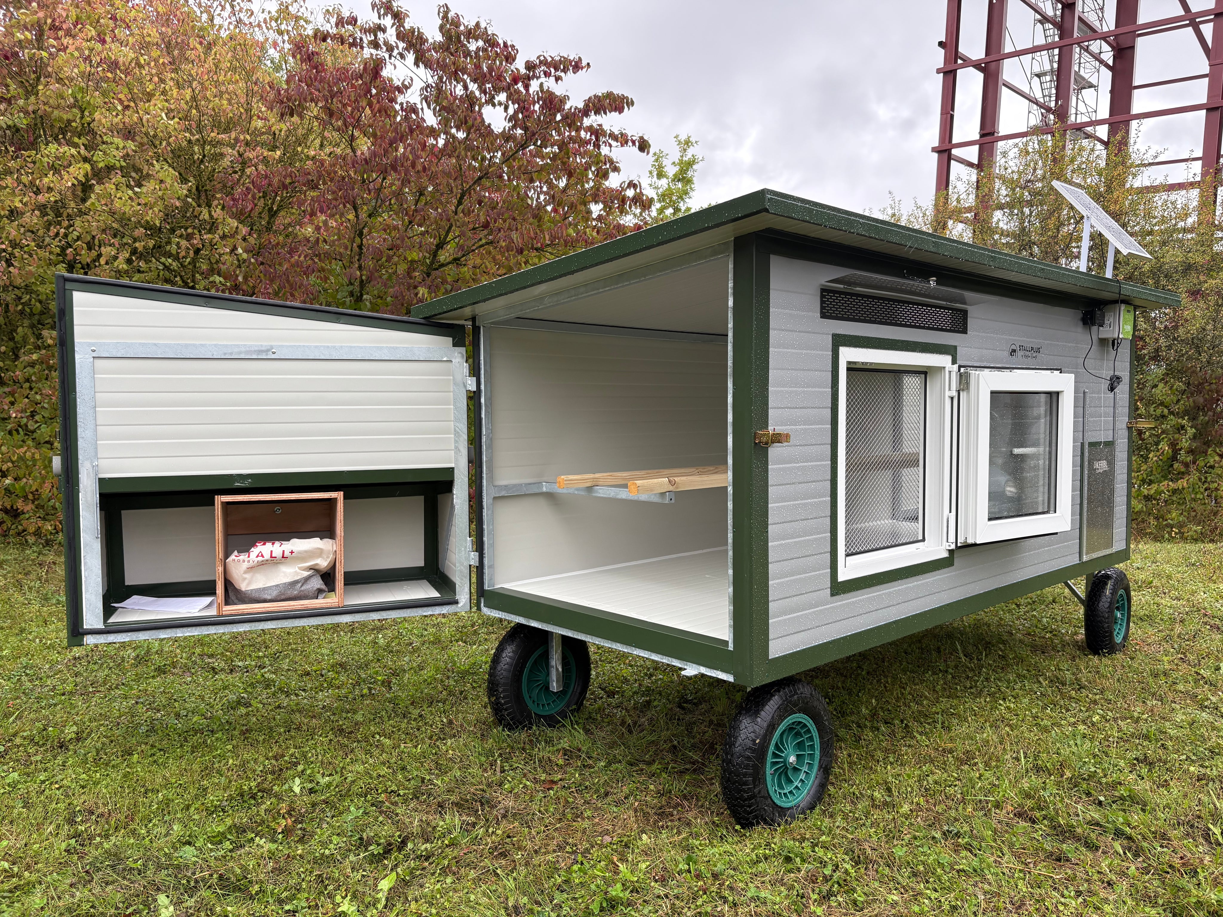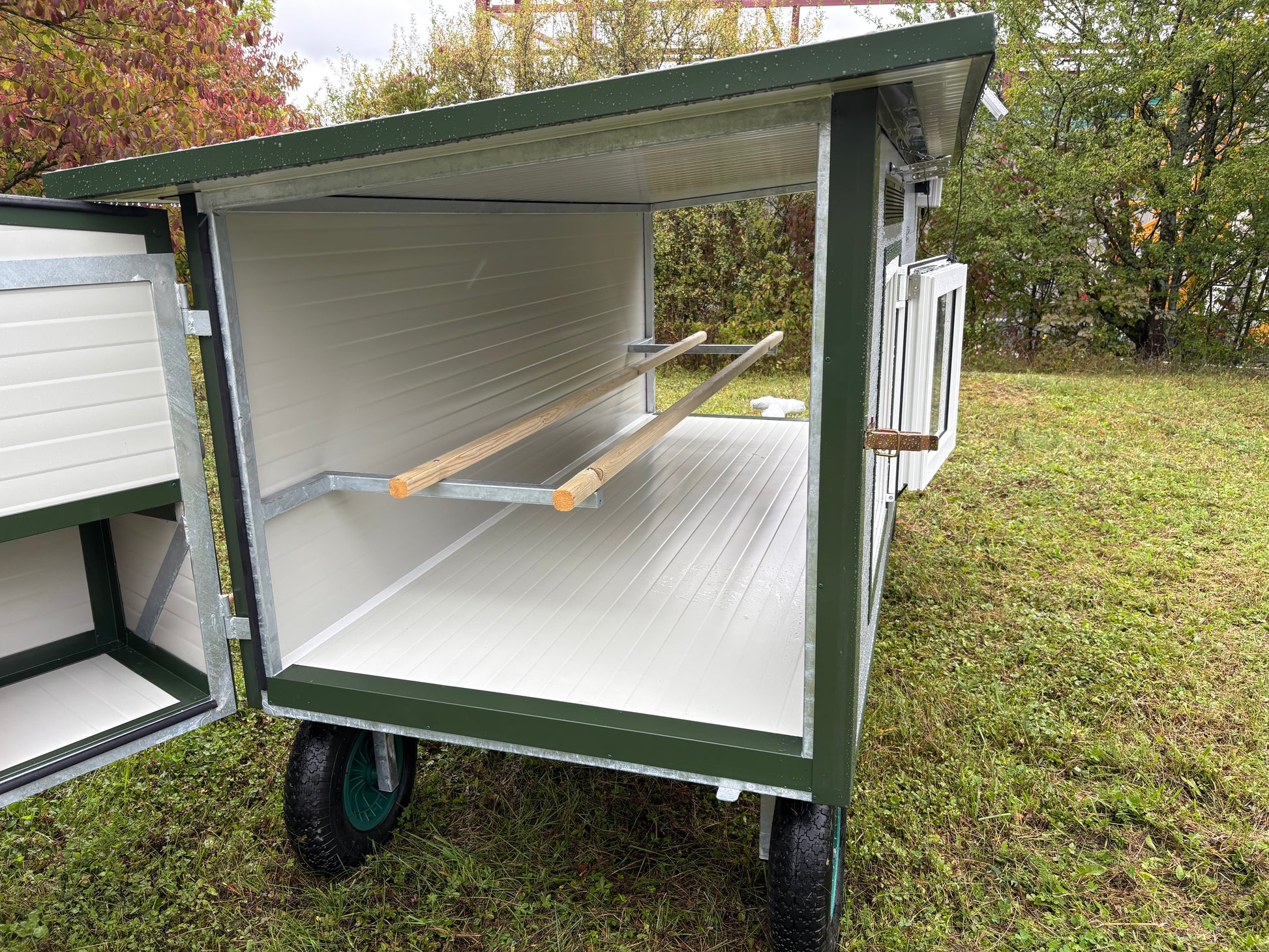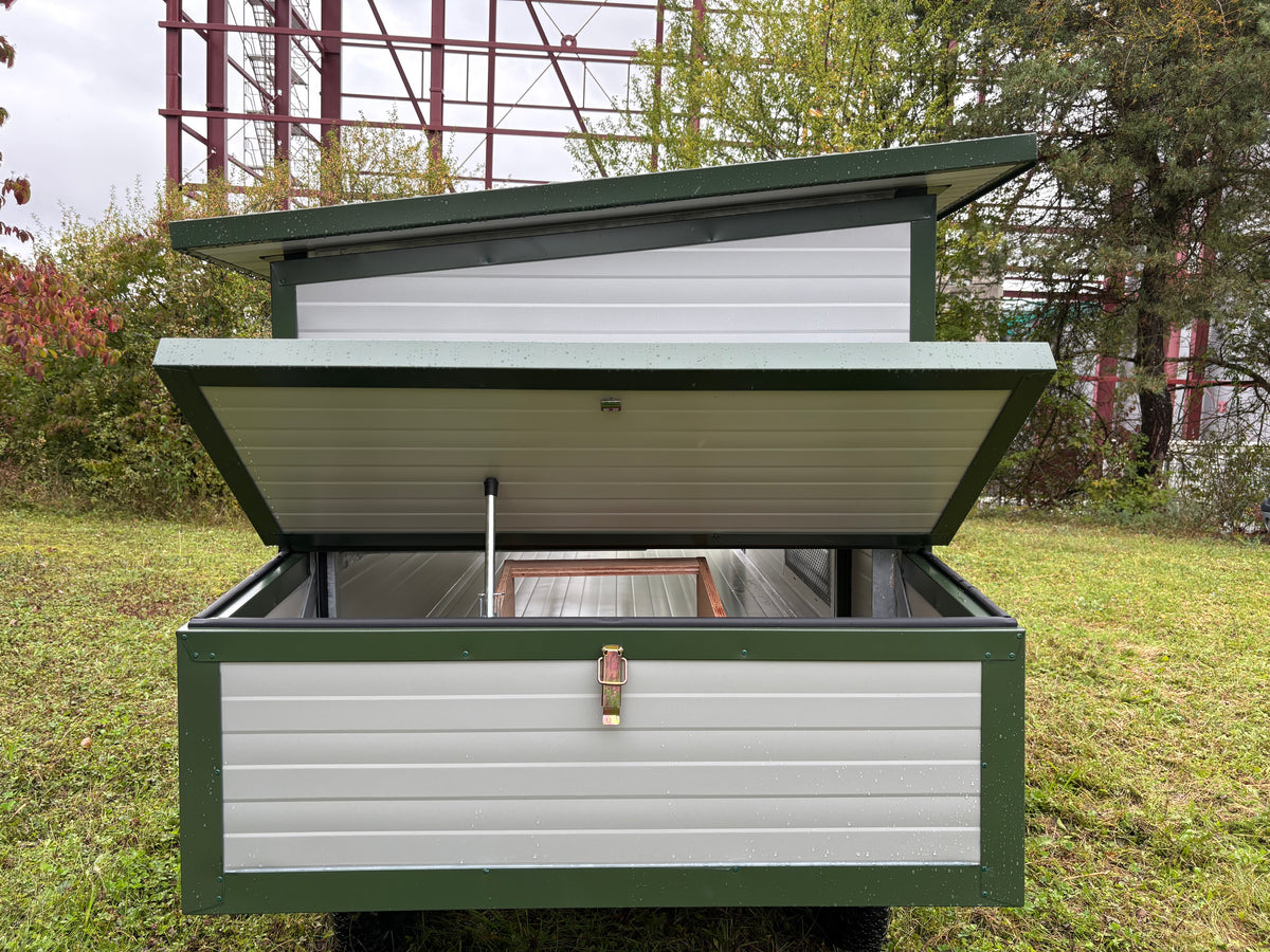 Hühnertüröffnung angepasst für JOST-Technik Klappe / Lackierte Konstruktion / RAL 6011 Resedagrün