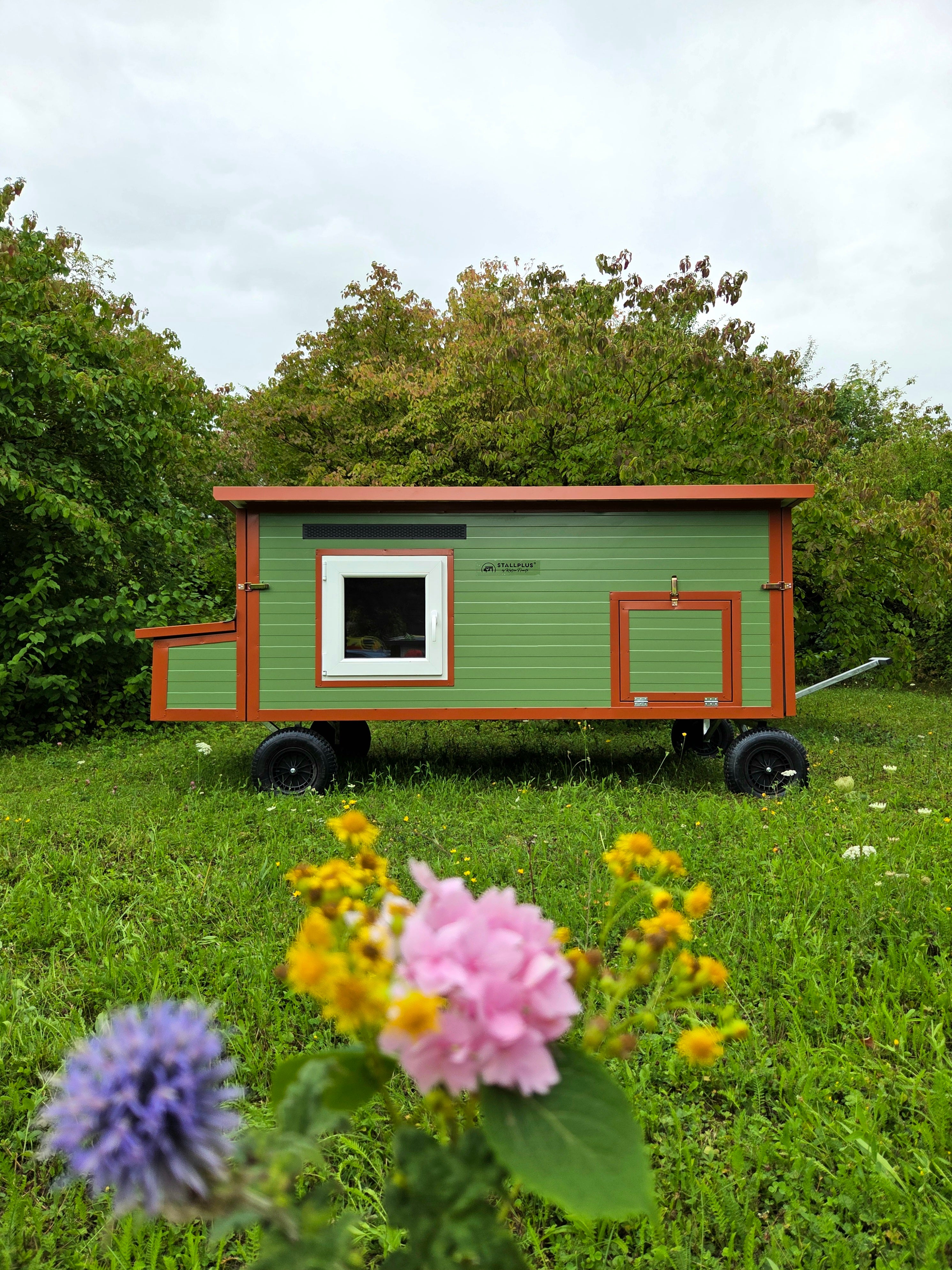 Hühnertüröffnung angepasst für JOST-Technik Klappe / Lackierte Konstruktion / RAL 6011 Resedagrün