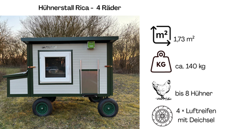 Der Rica H7 überzeugt durch seine robuste, isolierte Bauweise, vier Räder und eine praktische Deichsel. Er ist mit einem großen Fenster (60 × 60 cm), einem rückseitigen Lüftungsgitter und einer automatischen Hühnerklappe (Kerbl) ausgestattet.