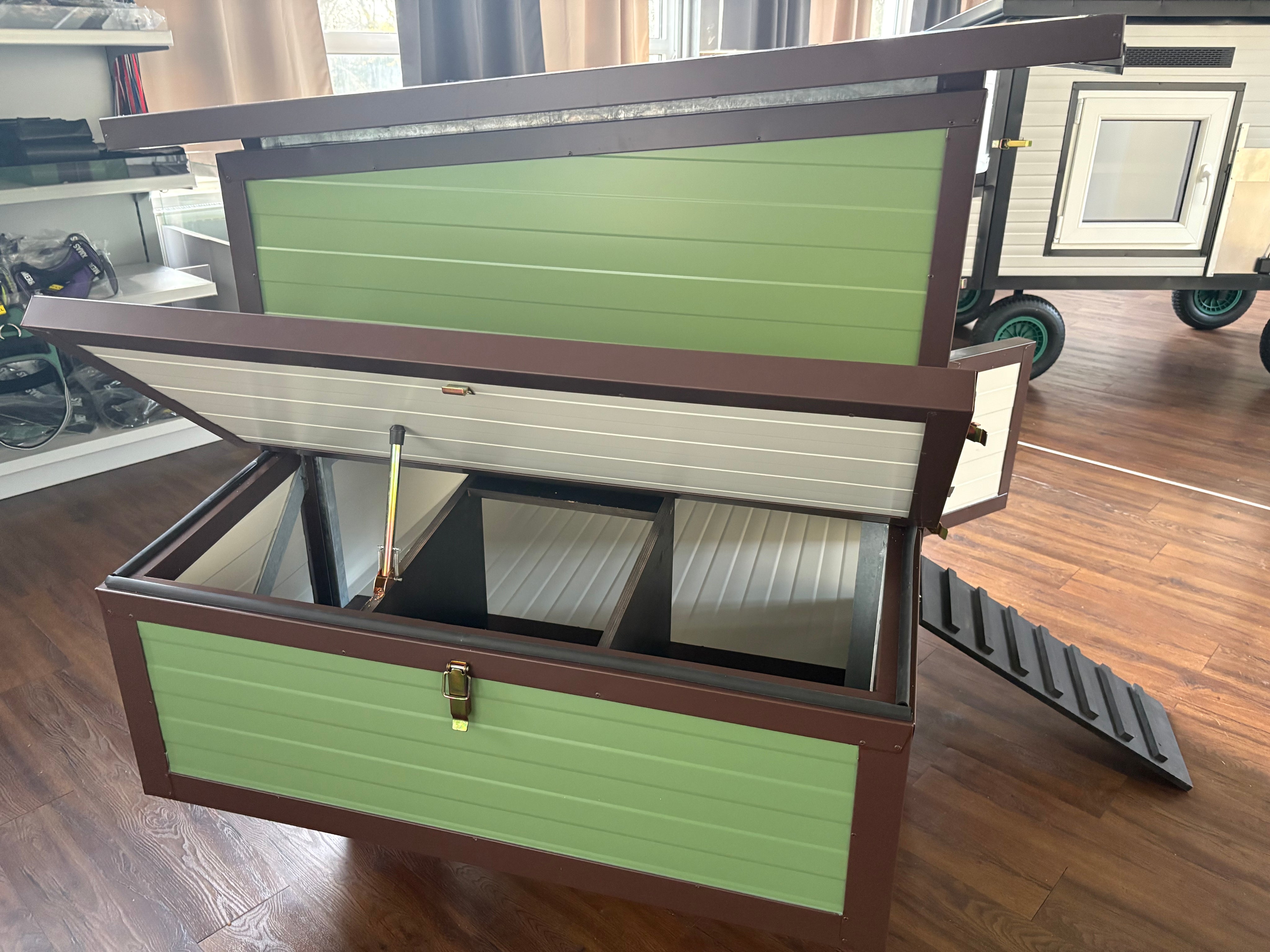 Maximale Flexibilität für Ihren Hof: Mit vier Rädern und Deichsel versetzen Sie den Stall mühelos – für frisches Gras, saubere Flächen und glückliche Hühner.