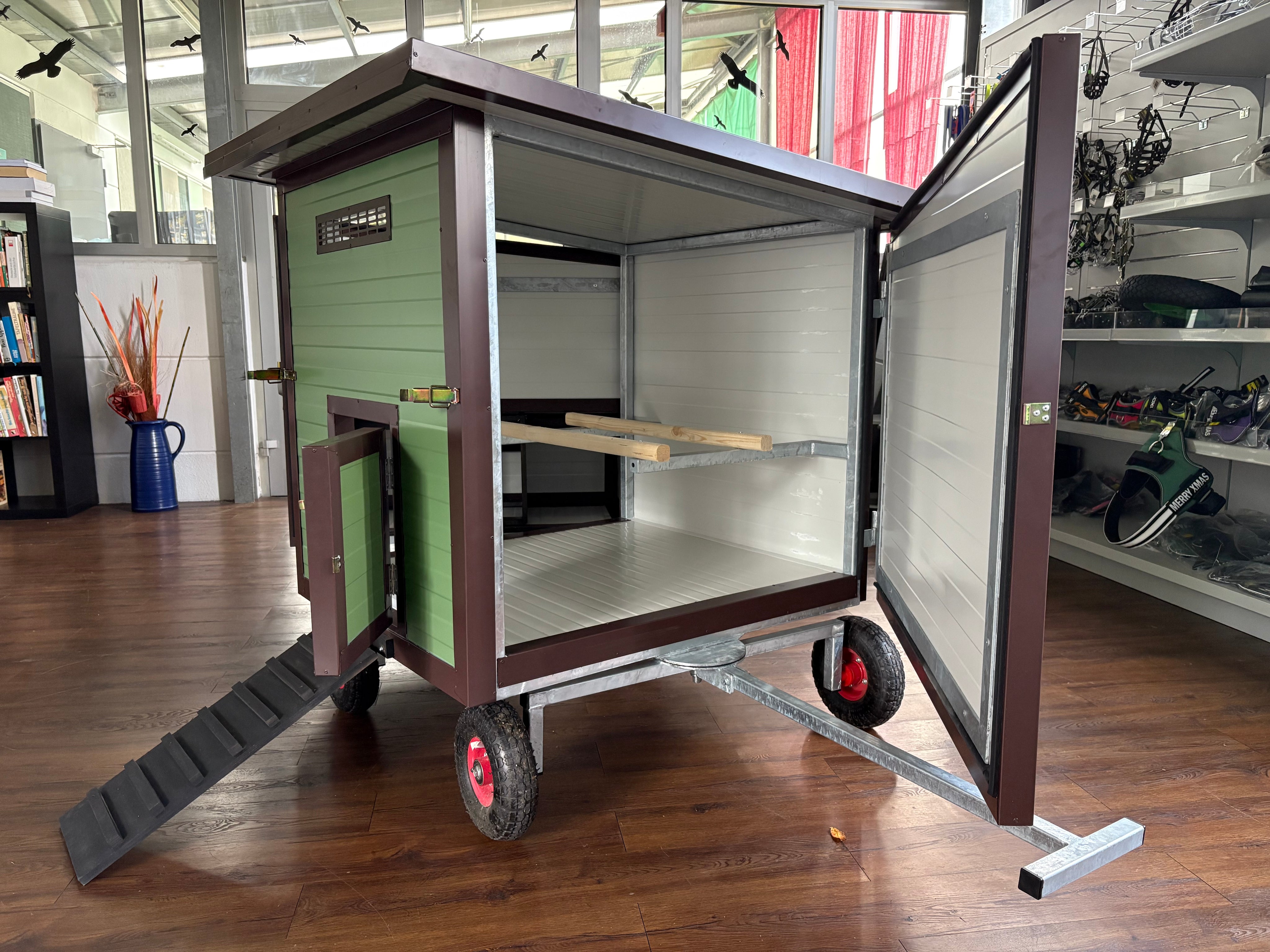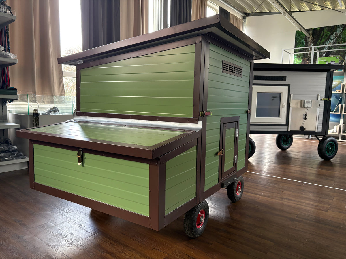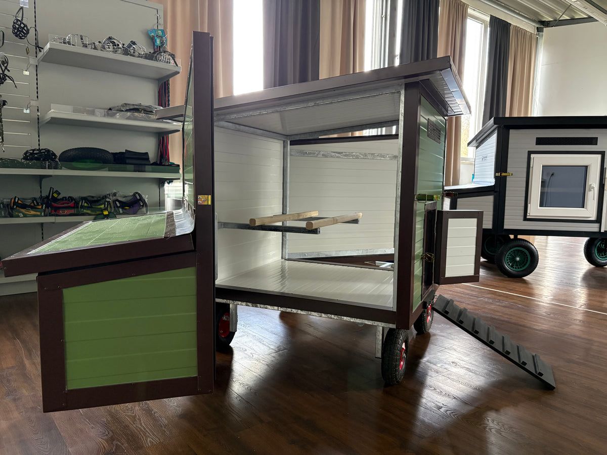 Der Rosi Mini Allrad vereint Mobilität und Komfort. Vier Räder mit Deichsel erleichtern das Umsetzen, zwei Seitentüren und eine zusätzliche Sommertür sorgen für Belüftung und einfache Reinigung. Der Nistkasten ist in die Seitentür integriert und klappbar; robuste Isolierung macht den Stall winterfest und pflegeleicht.