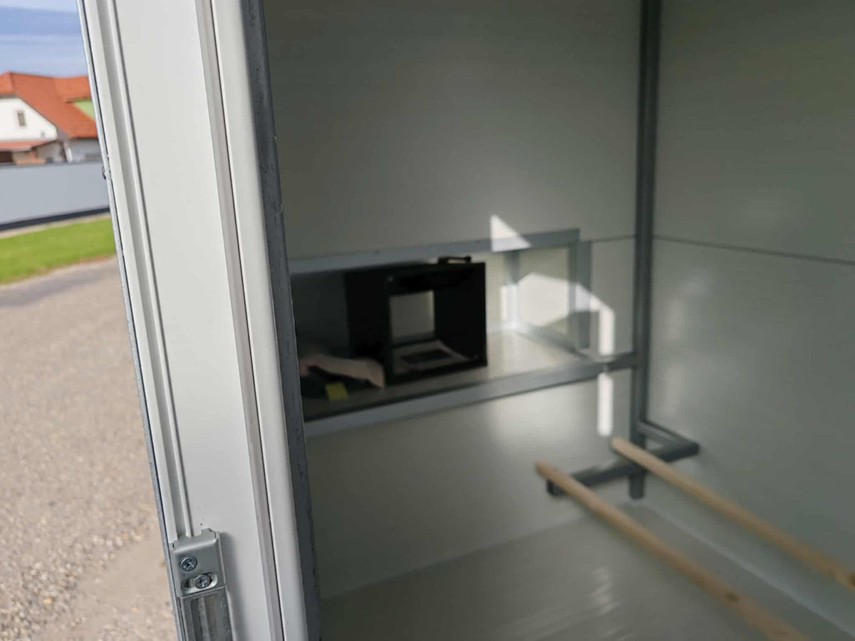 Innenmaße: Länge 232 cm, Breite 134 cm, Höhe vorne 198 cm, hinten 188 cm