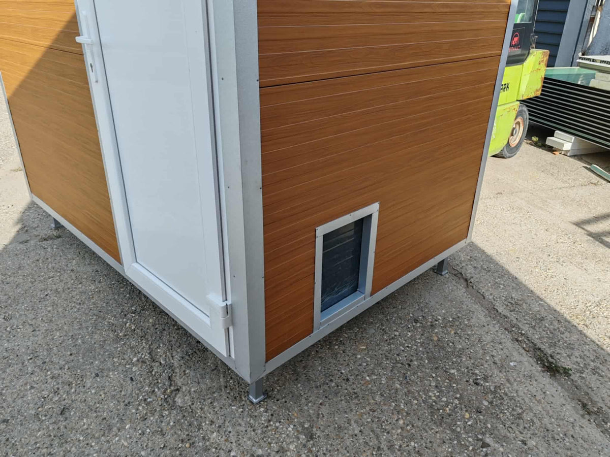 Die Wände bestehen aus 40 mm Sandwichplatten in RAL Holzoptik , die Kanten in Aluzink