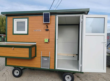 - Ein Hühnertüröffnung mit aut. Hühnerklappe Kerbl 30 x 40 cm inkl. Solar - Dreh und Kippfenster 60 x 60 cm (2-fach Verglast)
